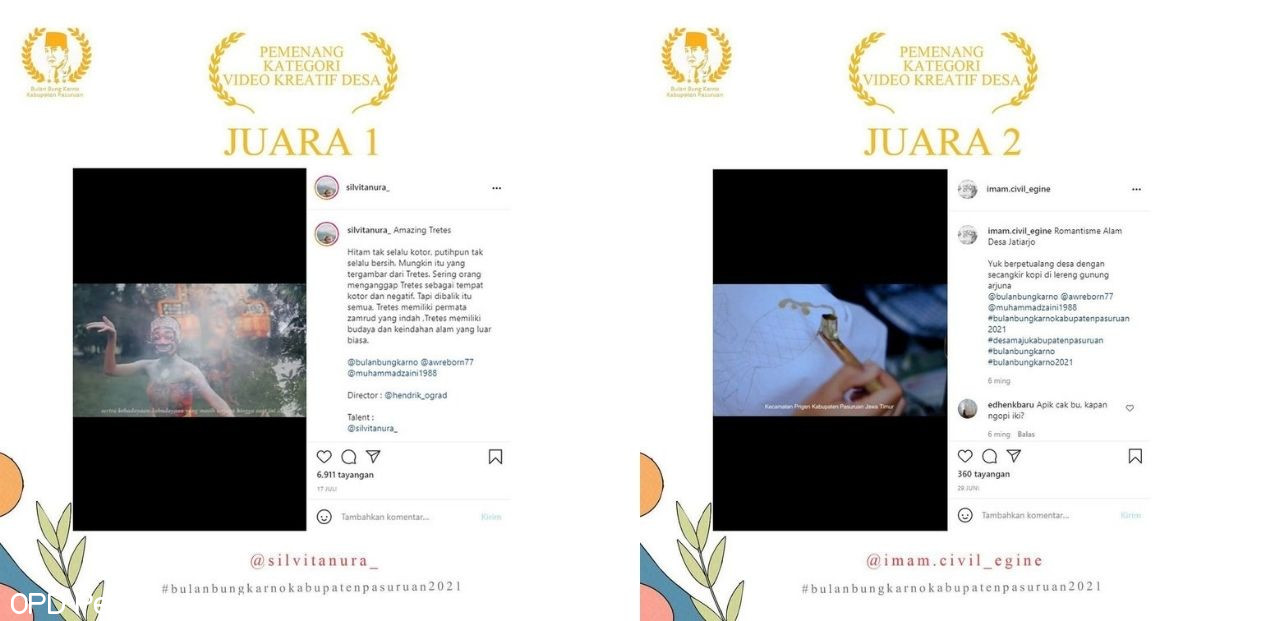 Para insan kreatif Prigen berhasil memenangkan lomba dalam ketegori Video Kreatif Desa yang diselenggarakan oleh Bulan Bung Karno (@bulanbungkarno) pada 29 Juni 2021 kemarin. Insan-insan kreatif Prigen ini berhasil menyabet Juara 1 dan Juara 2. Juara 1 dimenangkan oleh @hendrik_ograd dan @silvitanura dengan video berjudul Amazing Tretes. Juara 2 dimenangkan oleh @imam.civil_egine dengan video berjudul Romantisme Alam Desa Jatiarjo. Kedua daerah ini berada di kaki Gunung Arjuna dan Gunung Welirang yang sama-sama memiliki keindahan alam luar biasa. Para insan kreatif ini berhasil mengabadikan keindahan alam melalui lensa, membaginya kepada dunia, dan mebawa pulang piala. Selamat dan terima kasih atas kerja kerasnya!